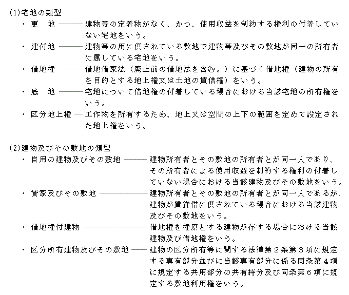 基準は、不動産の類型とは、その有形的利用及び権利関係の態様に応じて区分される不動産の分類をいうとし、宅地と建物及びその敷地について次のとおり例示しています。